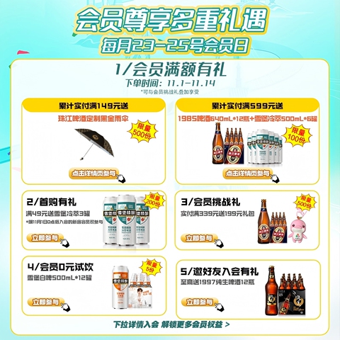 88VIP消费券到手价更低。单笔实付满99元加赠白啤500ml*3罐,珠江啤酒28°P烈金刚500mL*12罐*2整箱高浓原酿发酵官方旗舰店。超赞~