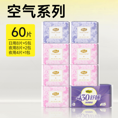 到手100片(5包日用共40片+2包夜用共16片+1包超长夜用共4片+下单还赠送40片护垫)升级透气Air棉3D云朵触感,突破性空气感黑科技,更薄更舒适!吸收量更大!迅速渗透不侧漏,持久干爽,让你忘记