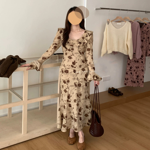 AK新款赫本风法式白裙长袖连衣裙女收腰气质显瘦中长裙