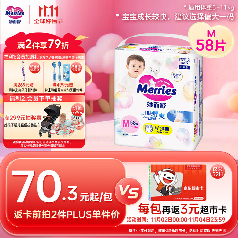 花王妙而舒拉拉裤M58片(6-11kg)中号婴儿尿不湿防漏宝宝屁屁舒爽畅玩