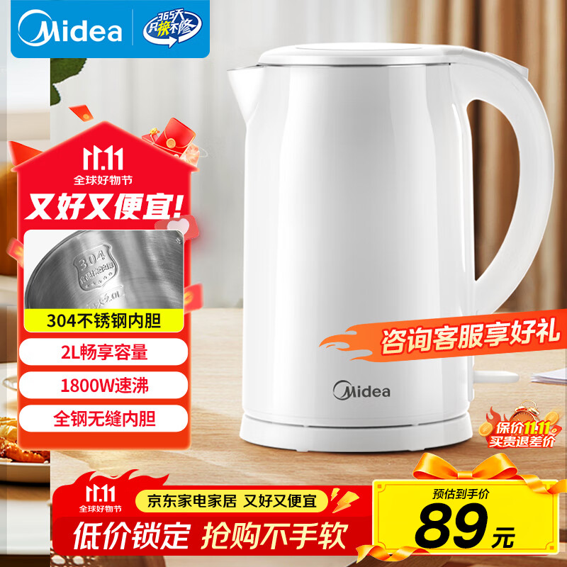 美的(Midea)电热水壶 2L大容量 1800W大功率速沸 双层防烫 304不锈钢无缝内胆 烧水壶电水壶 SH20M119