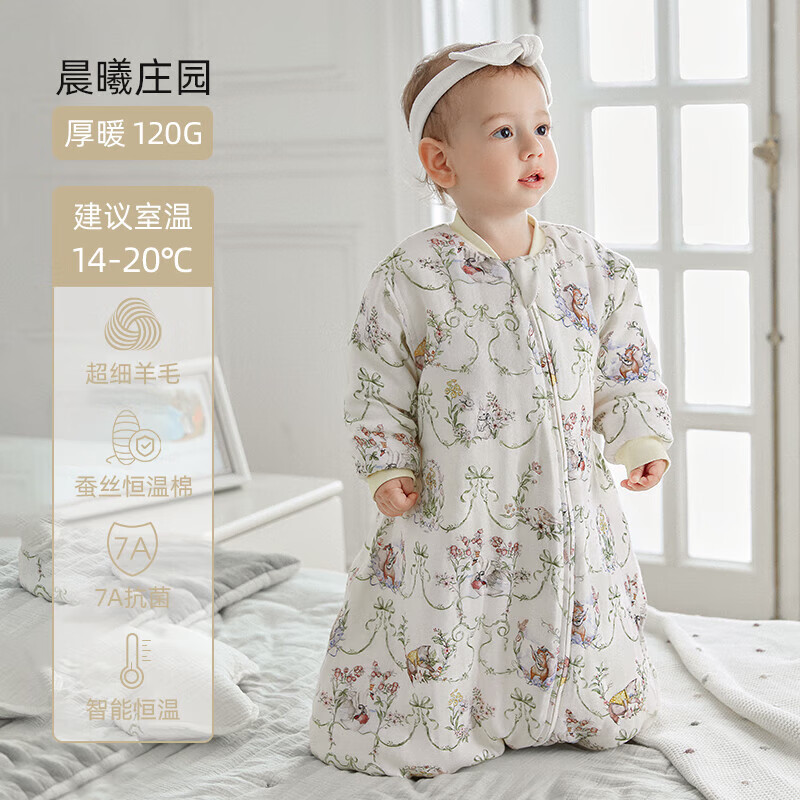 嫚熙(EMXEE)婴儿一体式睡袋新生儿秋冬恒温防惊跳羊毛桑蚕丝睡袋宝宝防踢被 【厚暖】晨曦庄园 14-20℃ 80码