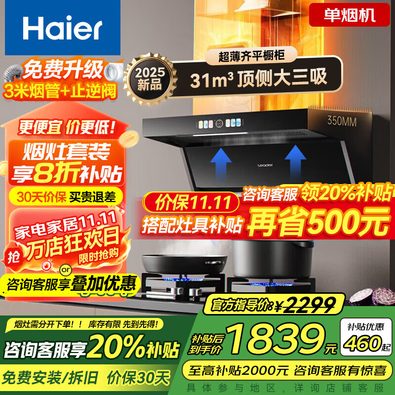 海尔(Haier)变频抽吸油烟机燃气灶具套装顶侧双吸家用31立方超大吸力油烟机挥手智控一键自清洗Leader系列 【AI智慧变频烟机】31m³大吸力1100Pa增压