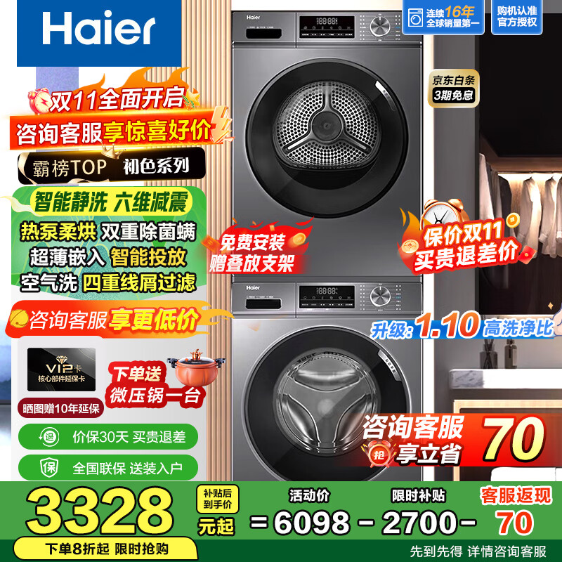 海尔洗衣机洗烘套装六维减震 超薄洗烘一体洗衣机烘干一体10公斤全自动滚筒洗衣机烘干机组合套装热泵 智能投放 1.1高配洗净比+空气洗+四层精滤+顽渍洗