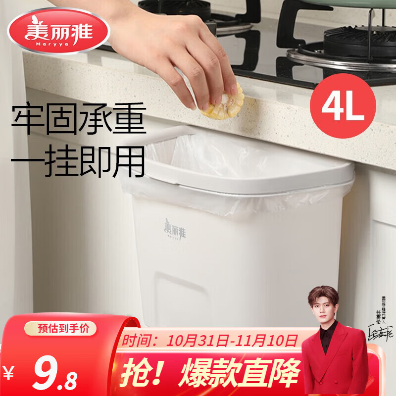 美丽雅 壁挂垃圾桶收纳桶塑料加厚家用无盖厨房橱柜分类悬挂式垃圾桶 白色【4L】-不影响柜门开合