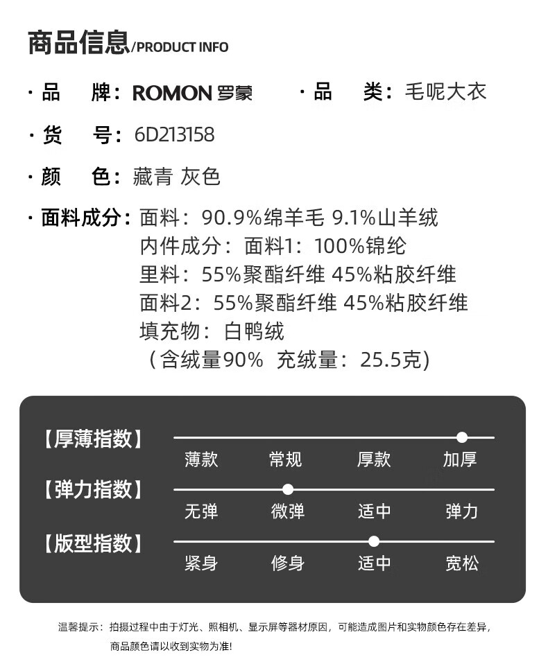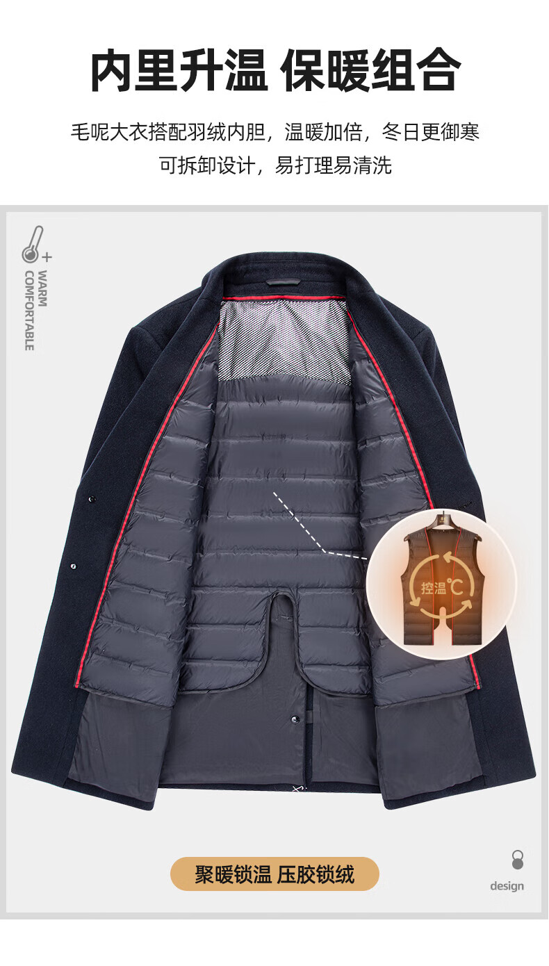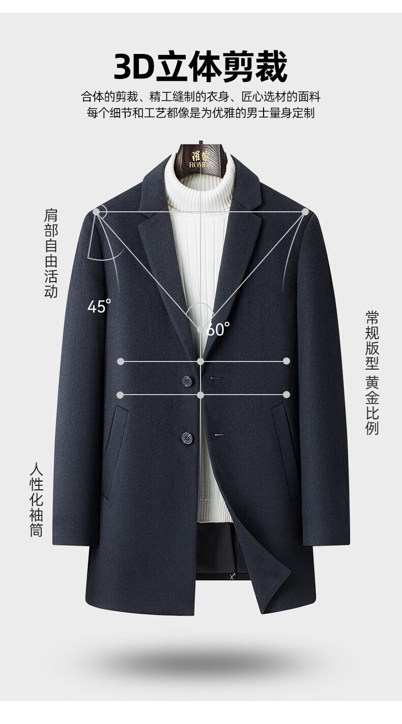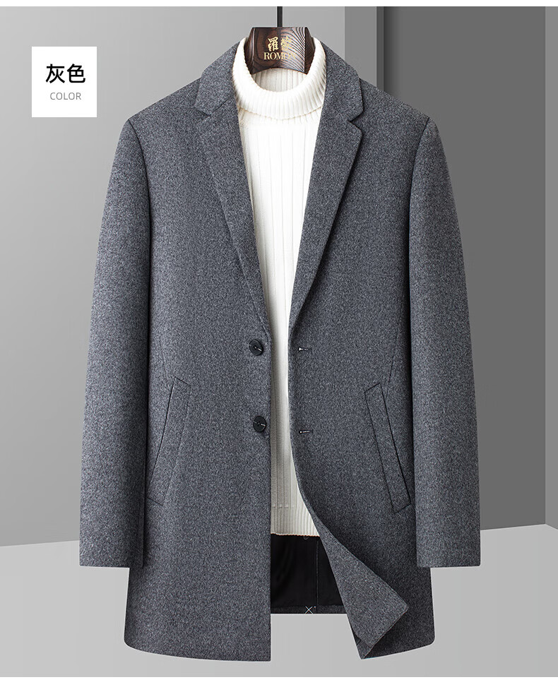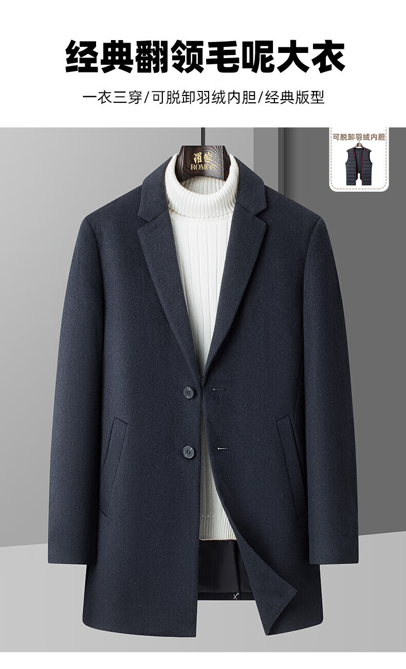 罗蒙(ROMON)【绵羊毛可脱卸羽绒内胆】商场同款毛呢大衣男中长款加厚保暖外套 灰色 L (175)