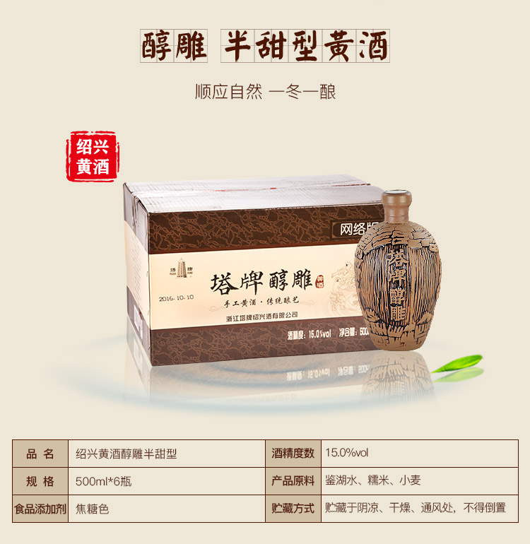塔牌 绍兴黄酒 醇雕 500ml*6瓶 15度 半甜型 整箱装 手工黄酒 500mL 6瓶 整箱装